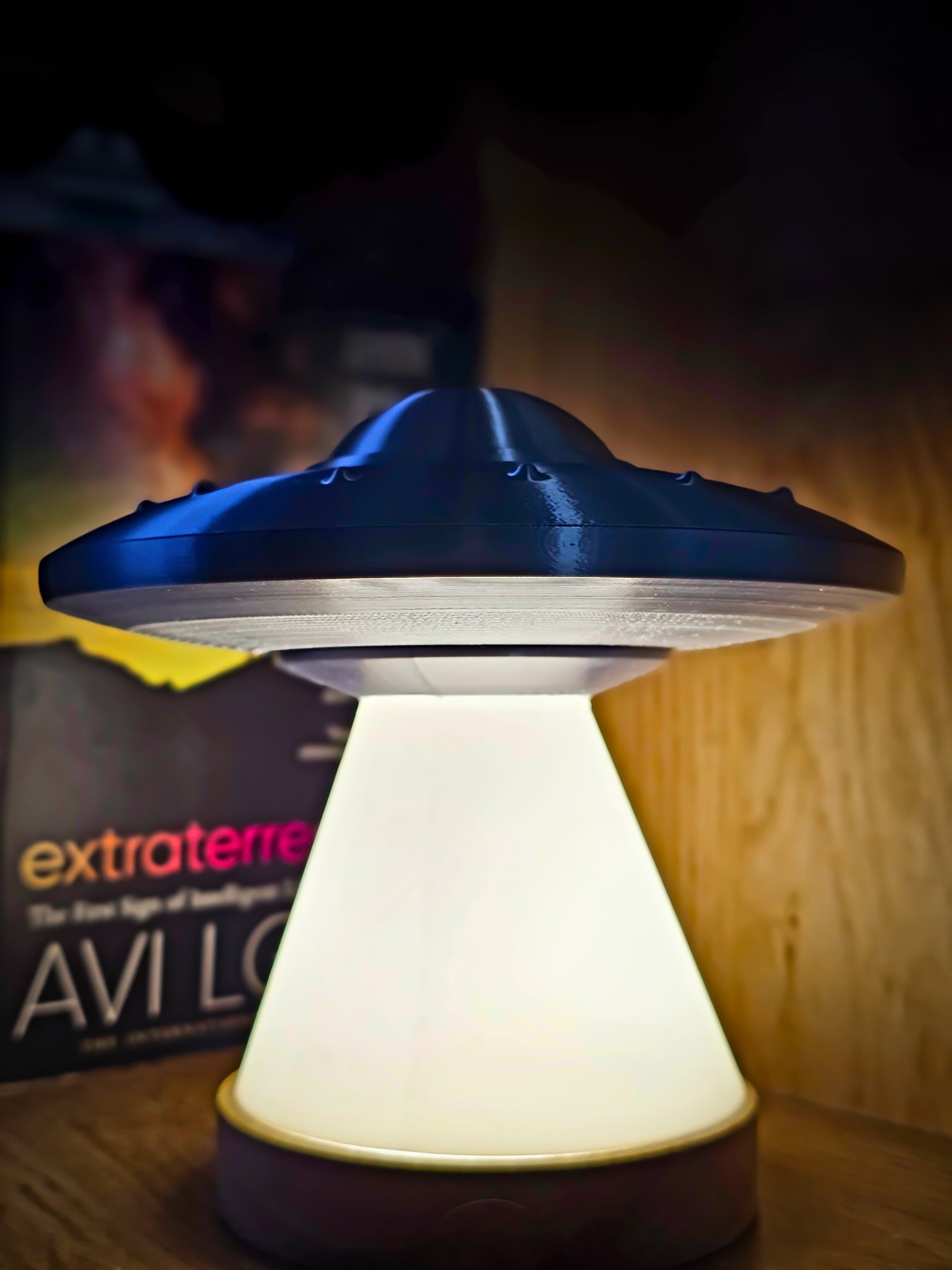 - White USB Light Base: Ideal for clean, crisp illumination, this base casts a steady white light, showcasing the UFO’s design details in a calming, futuristic glow.