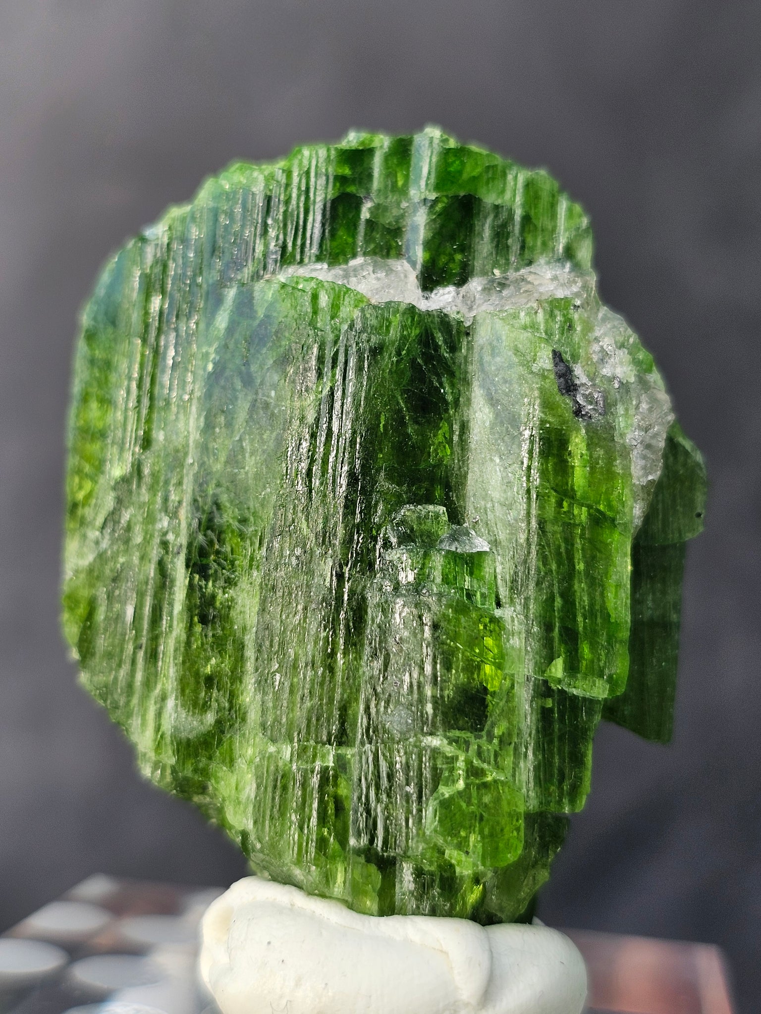 Chrome tremolite from Tanzania: chromium‑bearing amphibole in bladed to acicular crystals. Even green saturation, translucent edges and crisp terminations define choice pieces.