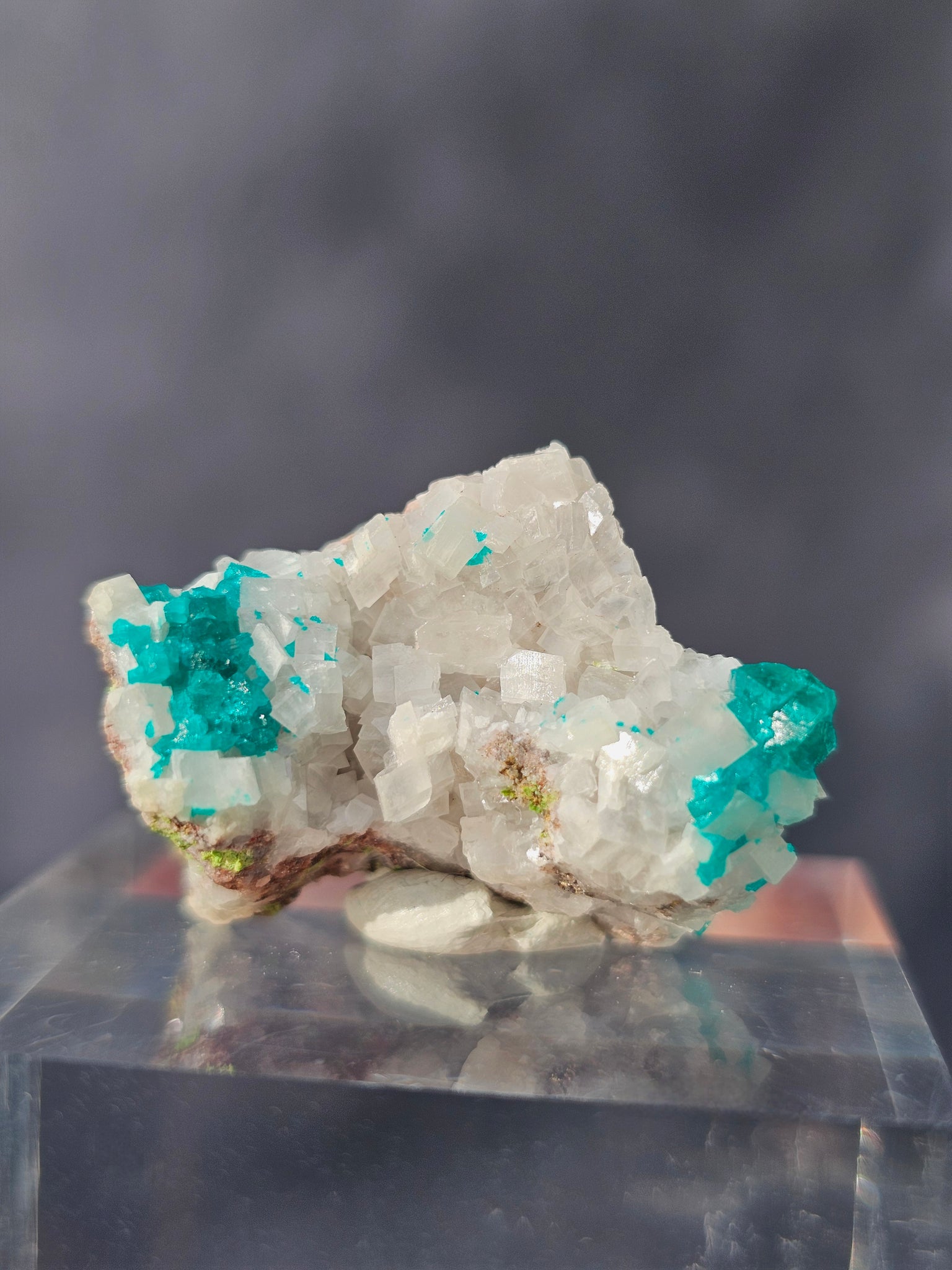Dioptase with calcite: emerald‑green dioptase crystals perched on pale calcite provide striking contrast. Sharp, glassy dioptase and intact calcite rhombohedra are key quality markers for display pieces. Special features: from Tsumeb mine - very collectible.