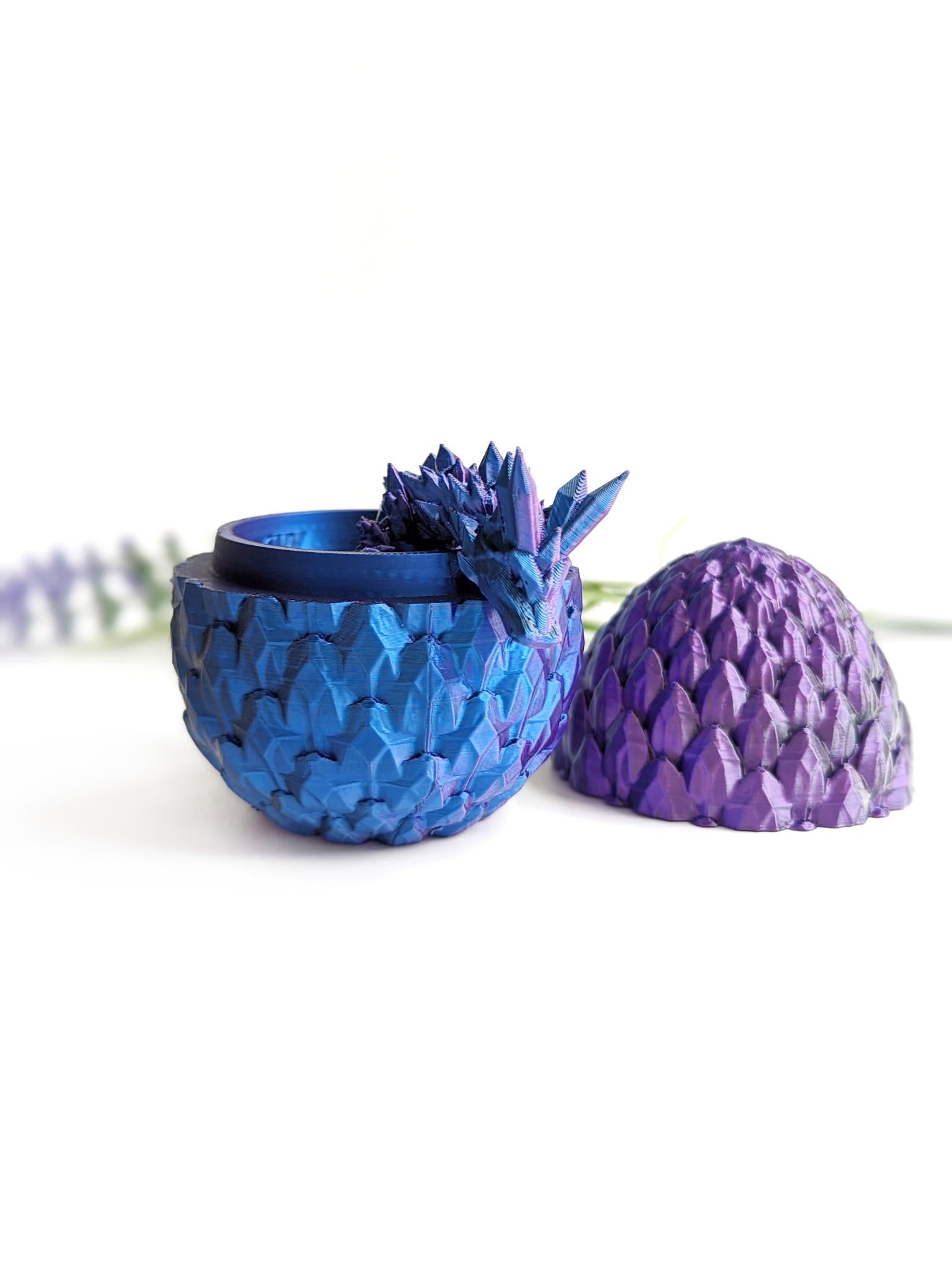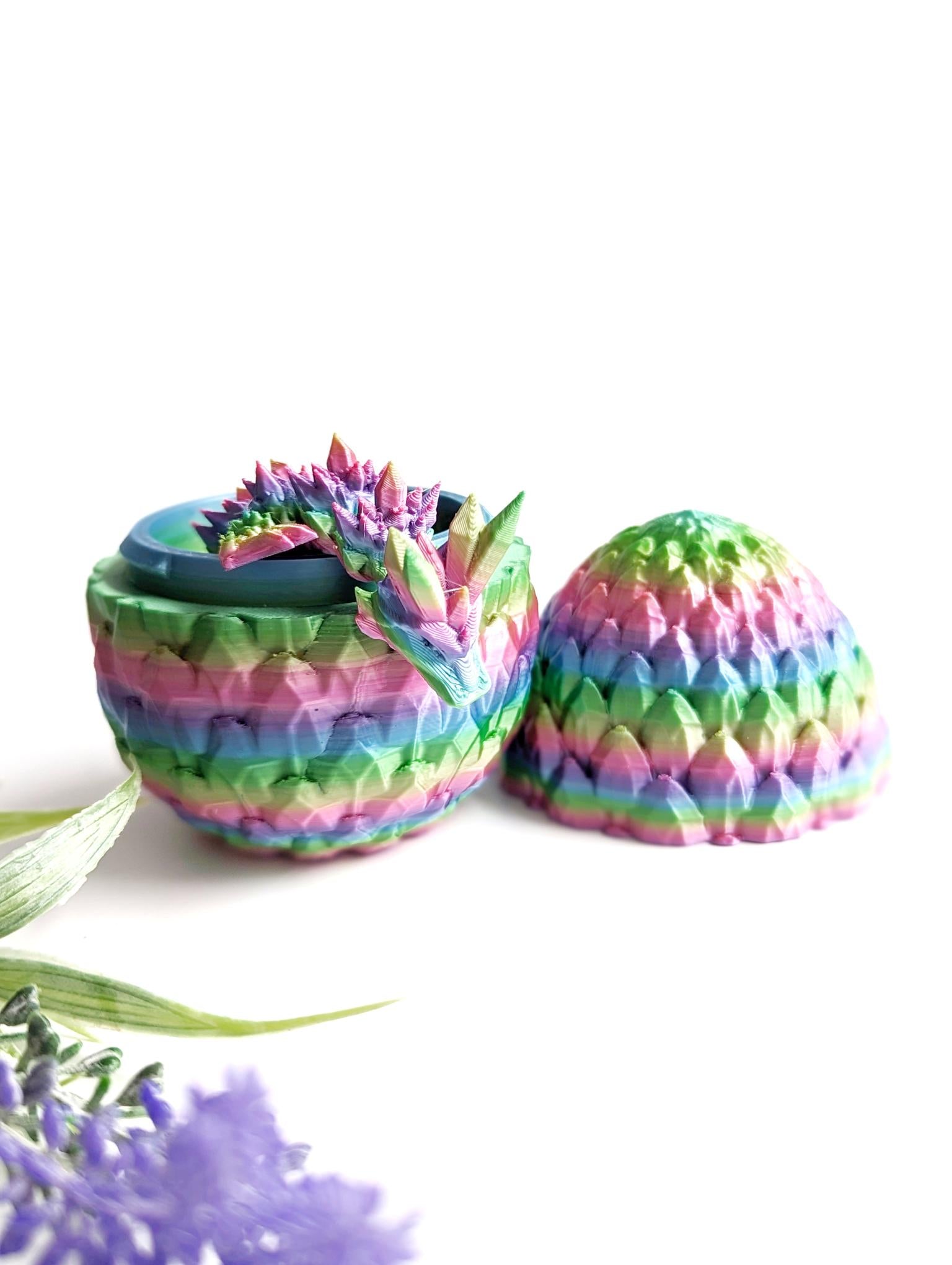 Both egg and dragon are 3D printed with state of the art machinery and plant-based filament. Choose from a range of colours including our best-selling colourshift range.