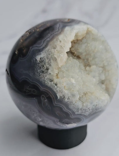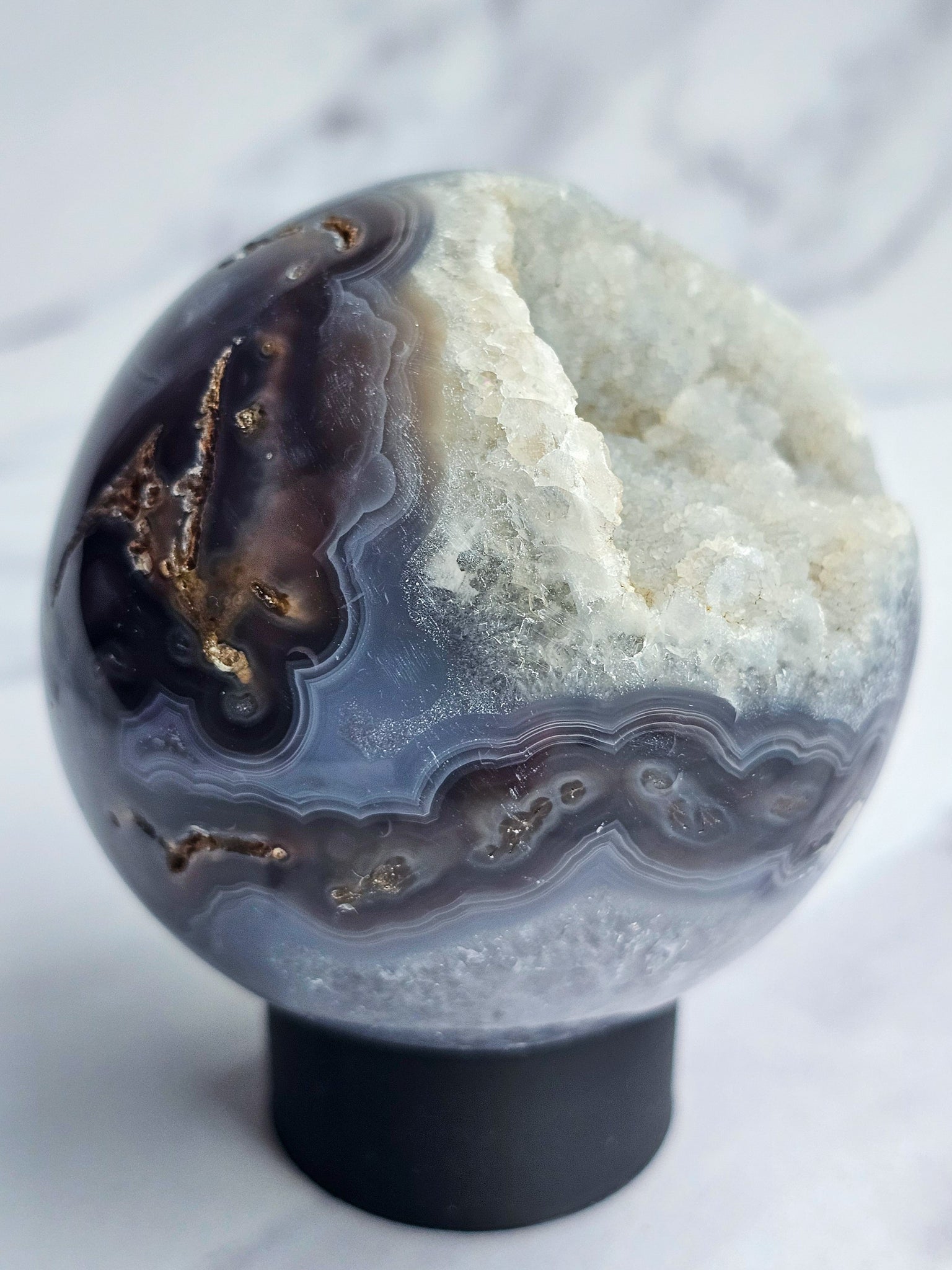 This enchanting druzy purple moss agate sphere showcases intricate moss-like inclusions in shades of deep purple, accented by sparkling druzy formations that glimmer in the light. The natural patterns and vibrant hues make this piece both visually stunning and energetically uplifting. Sourced from India, this specimen is a harmonious blend of beauty and grounding energy.