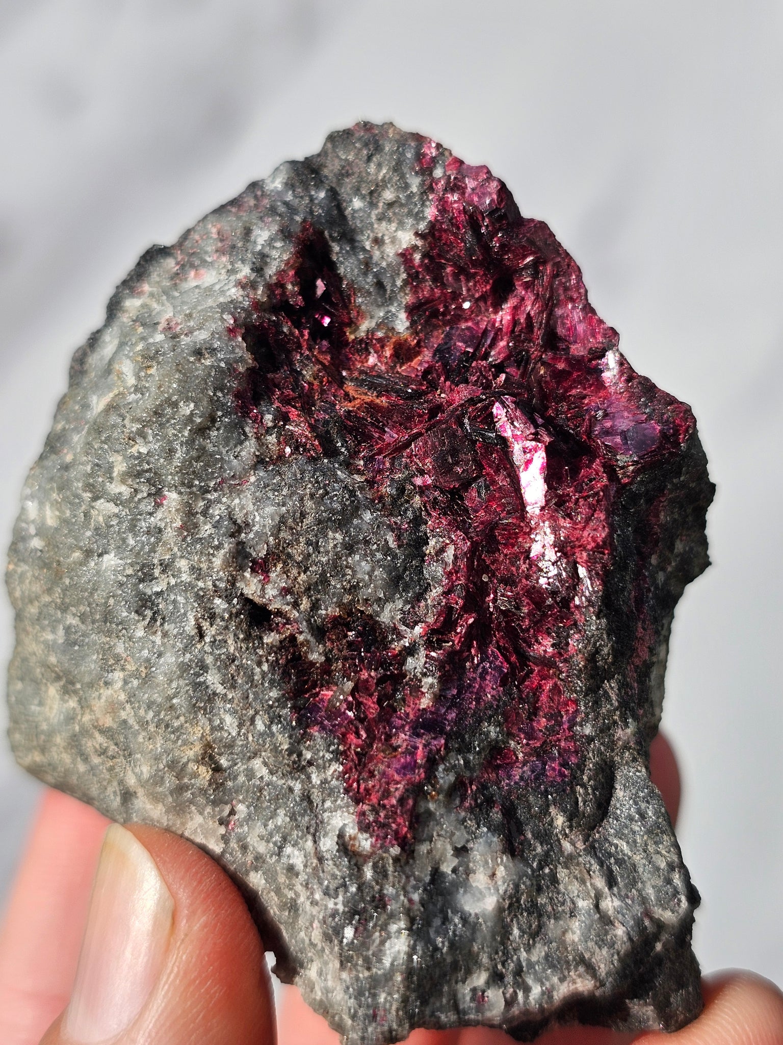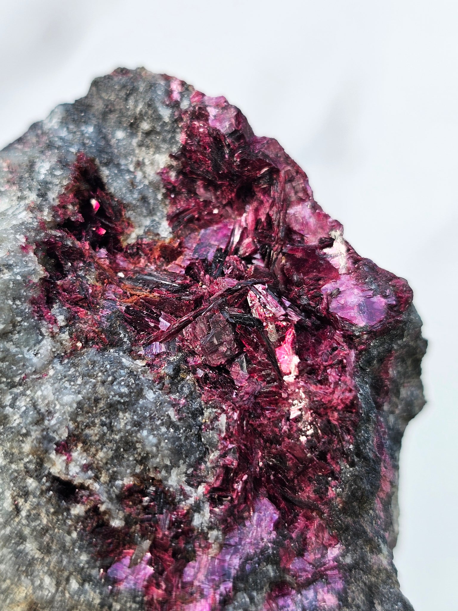 Erythrite: vivid crimson‑magenta cobalt arsenate forming acicular sprays and crusts on matrix. Colour intensity, fresh silky luster and undisturbed sprays distinguish fine specimens; protect from strong light to preserve hue.