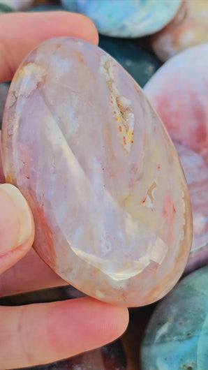 Flower Agate (Cherry Blossom Agate) features delicate flower‑like plumes symbolising growth, self‑discovery, and new beginnings. Its soothing, nurturing energy makes it a favourite for gentle motivation and calm.