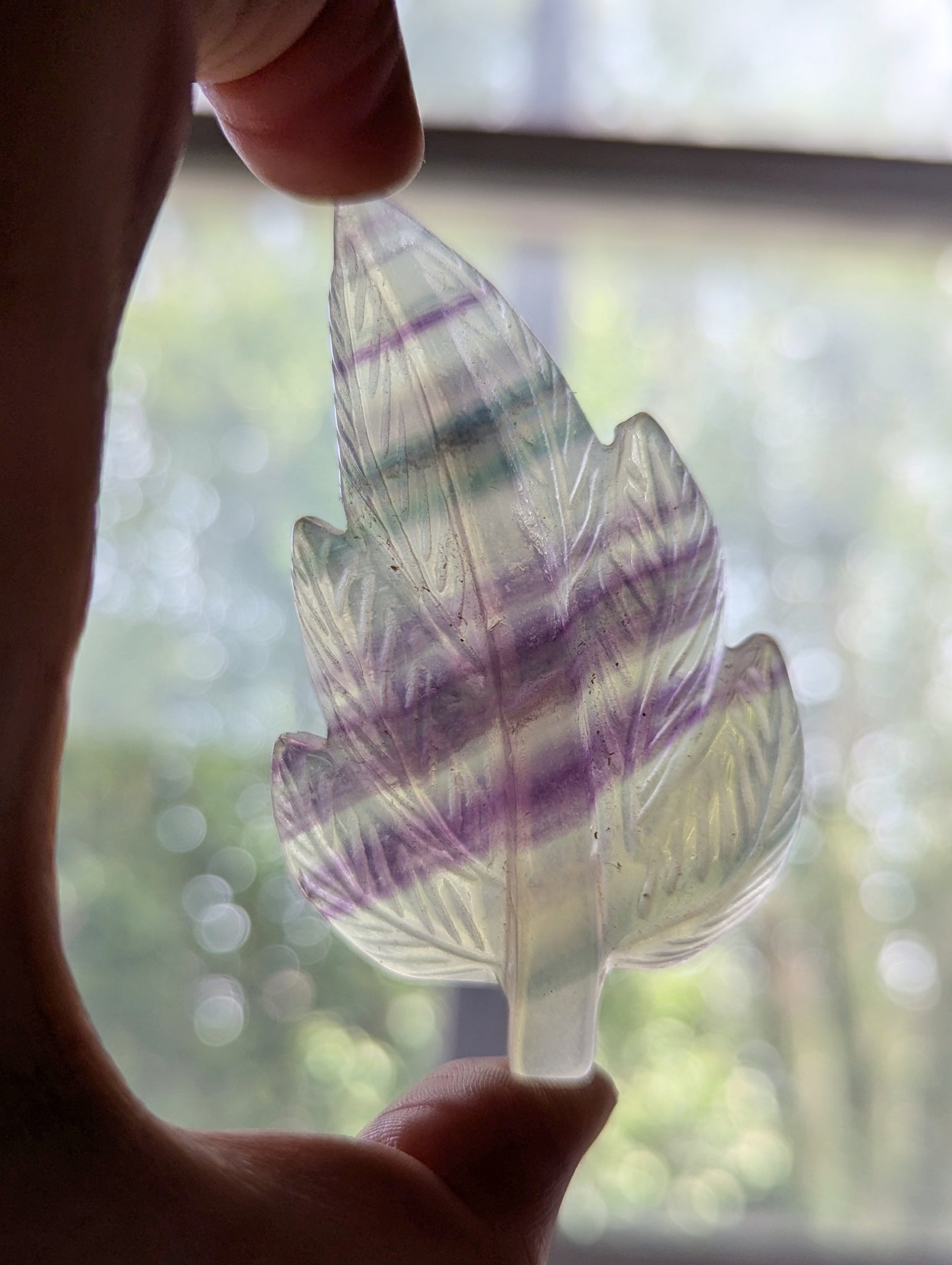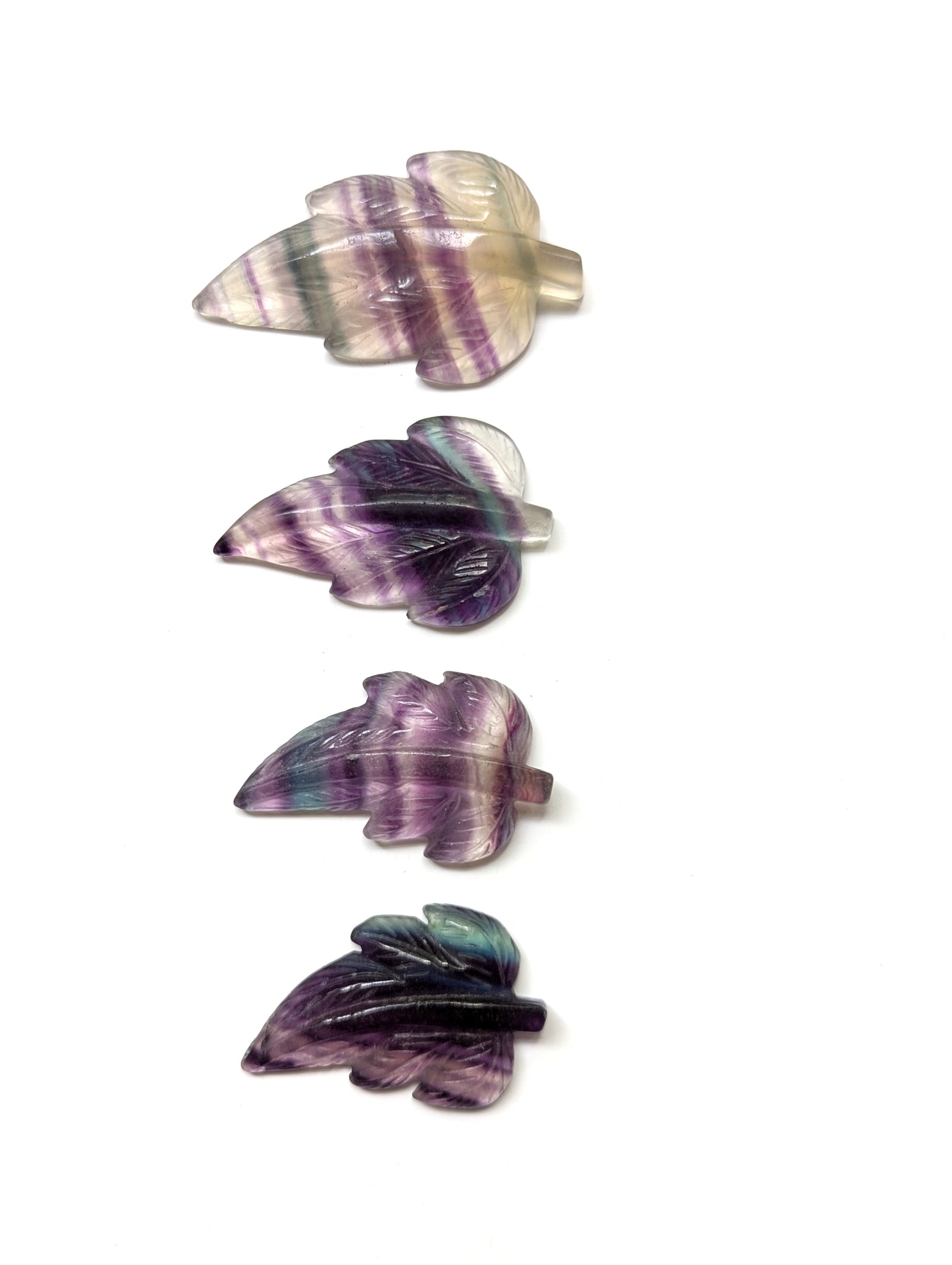 The beauty of fluorite, hand carved into detailed leaves - these are stunningly made and show off the banded colours of rainbow fluorite in the best way!