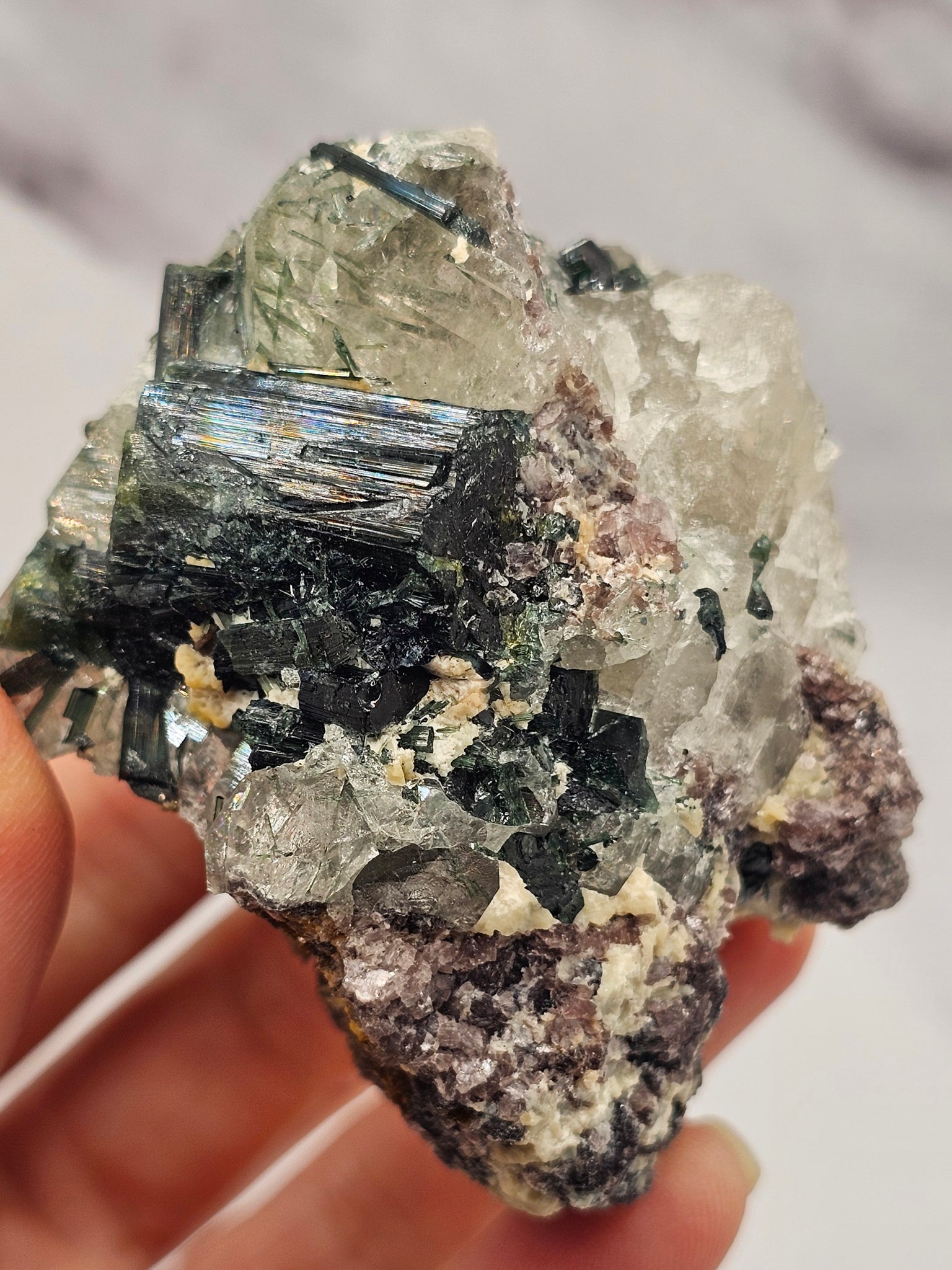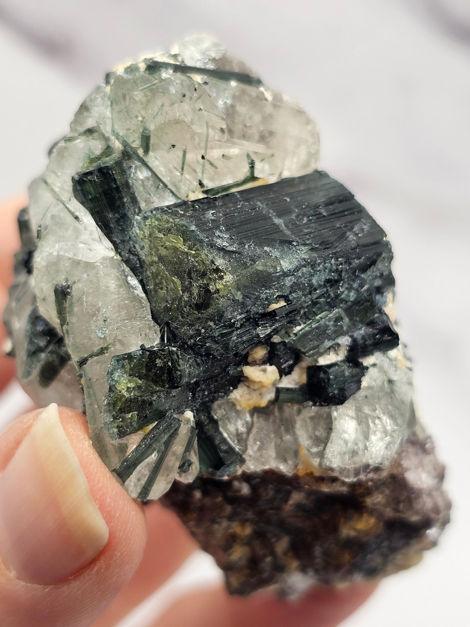 - Clear quartz with internal and external green tourmaline