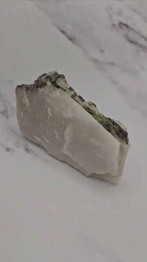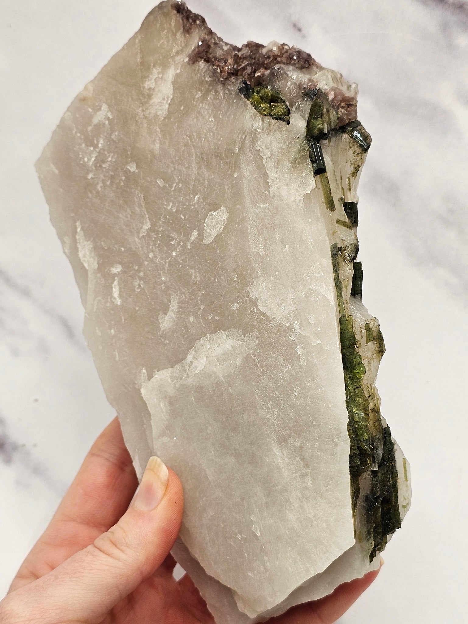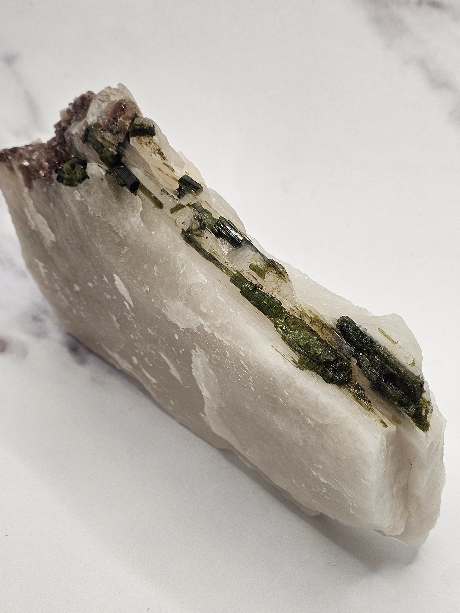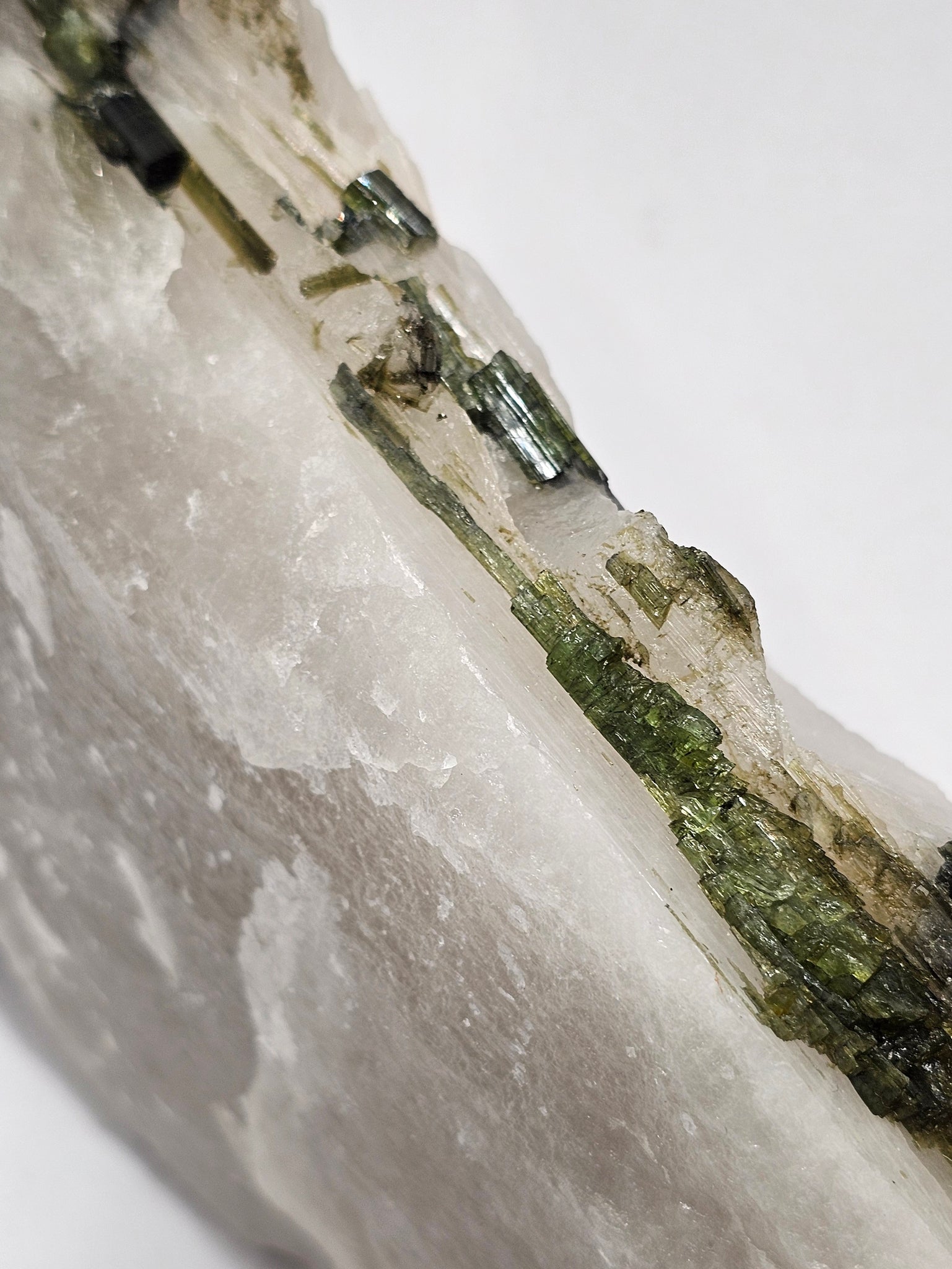 - Thumbnail sized area of quartz thats terminated with penatrator needles of green tourmaline