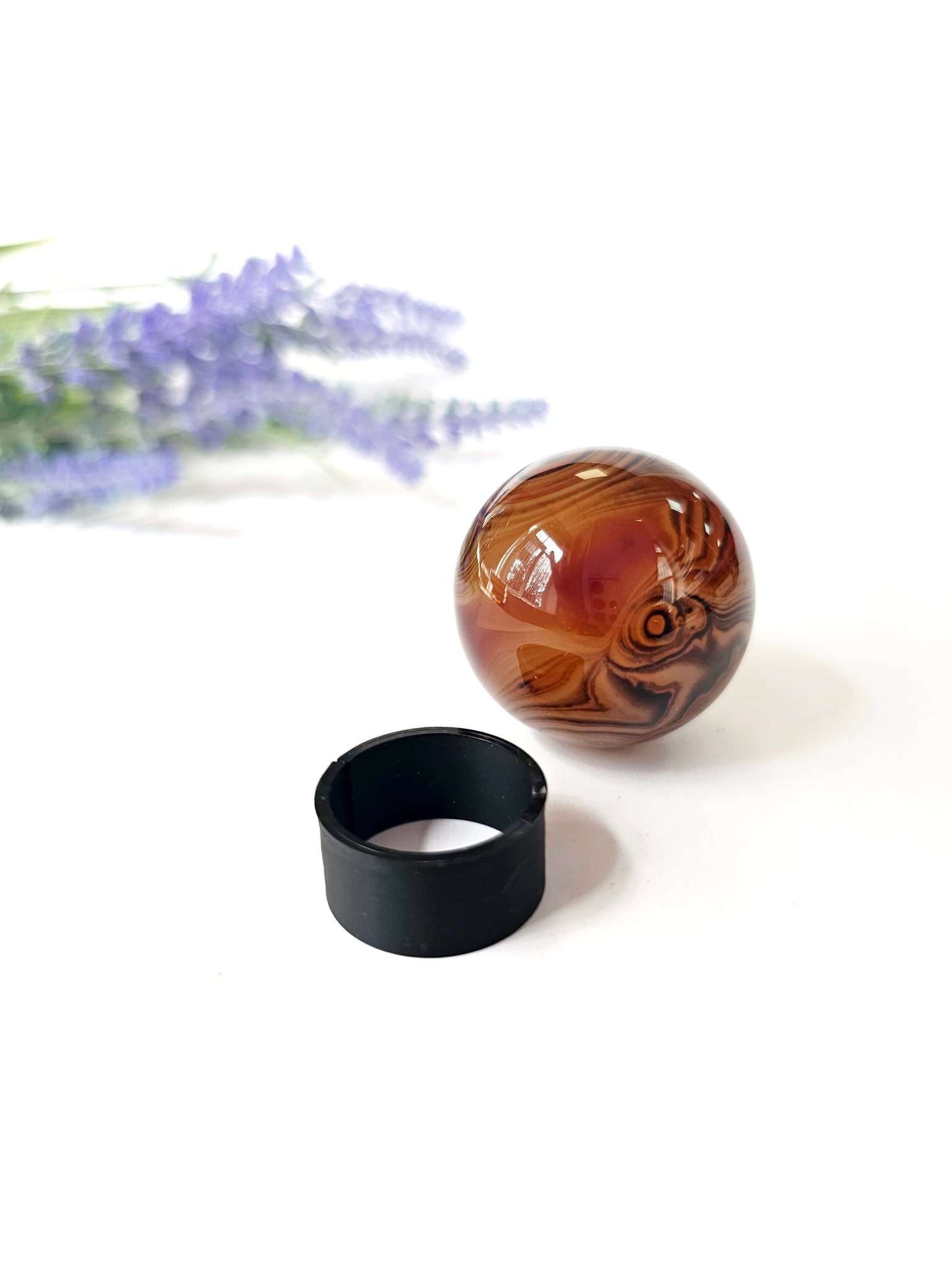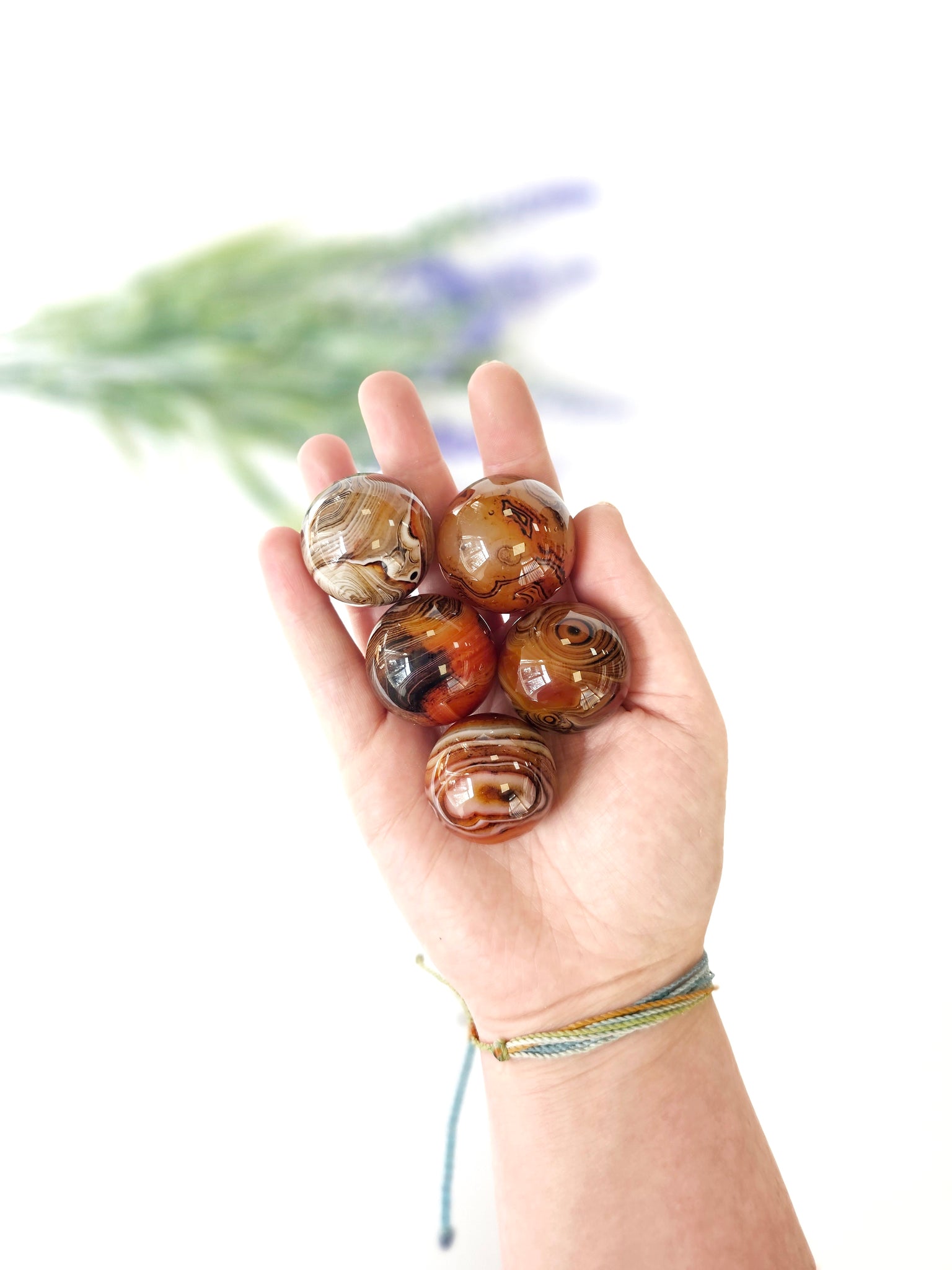 These stunning sardonyx mini spheres feature interesting bands of reds, oranges, browns and creams, curling around in a way reminiscent of tree rings. Each is beautifully unique! These mini spheres are perfect for creating a layered look on your crystal display shelves, or popping in your pocket!