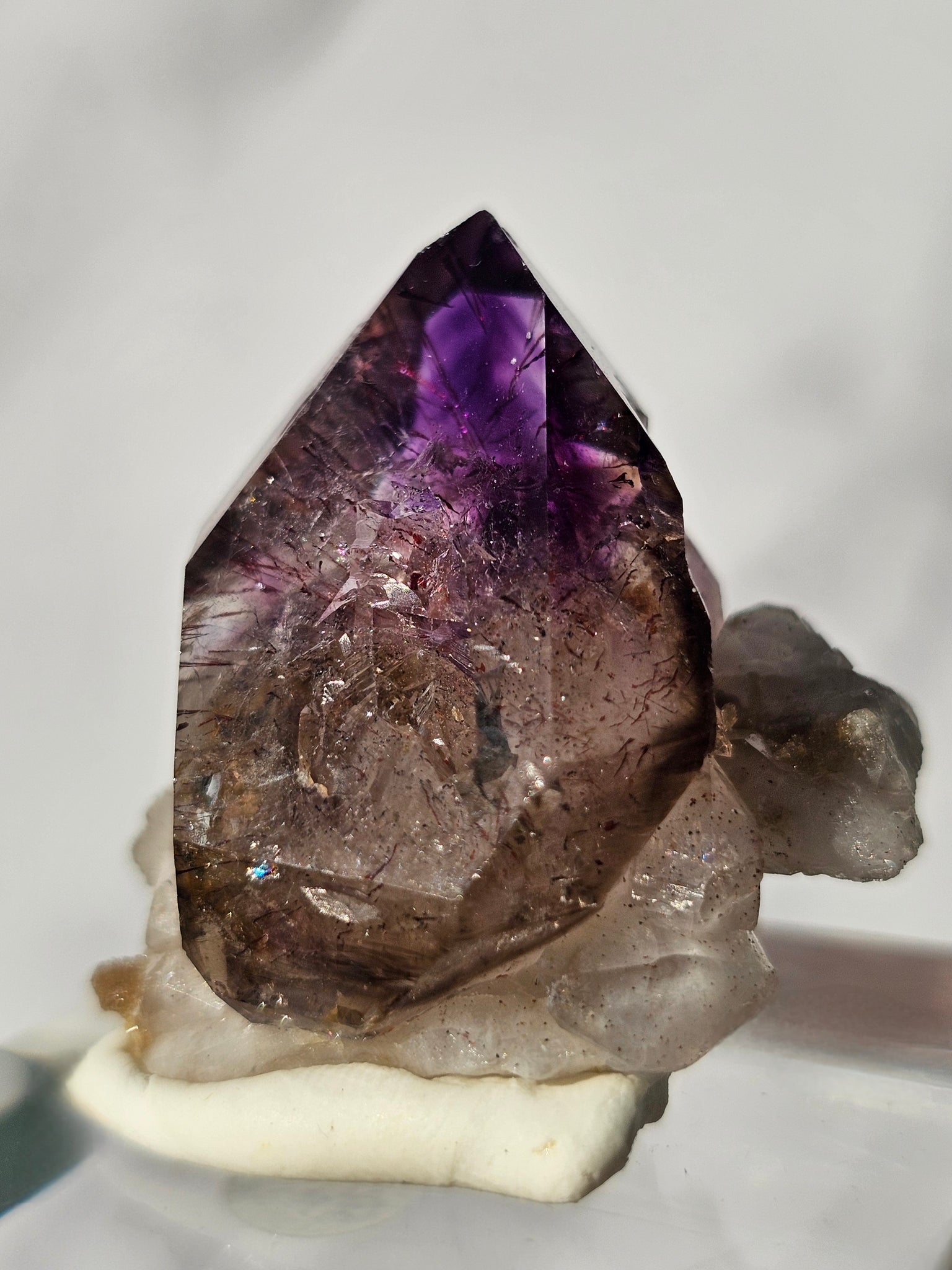 'Shangaan' Amethyst from Chibuku, Zimbabwe (named after the Shangaan tribe): deep purple quartz often with smokey zoning, hematite inclusions and sceptred habits. Sharp faces, centred colour and high clarity are the hallmarks sought by collectors.