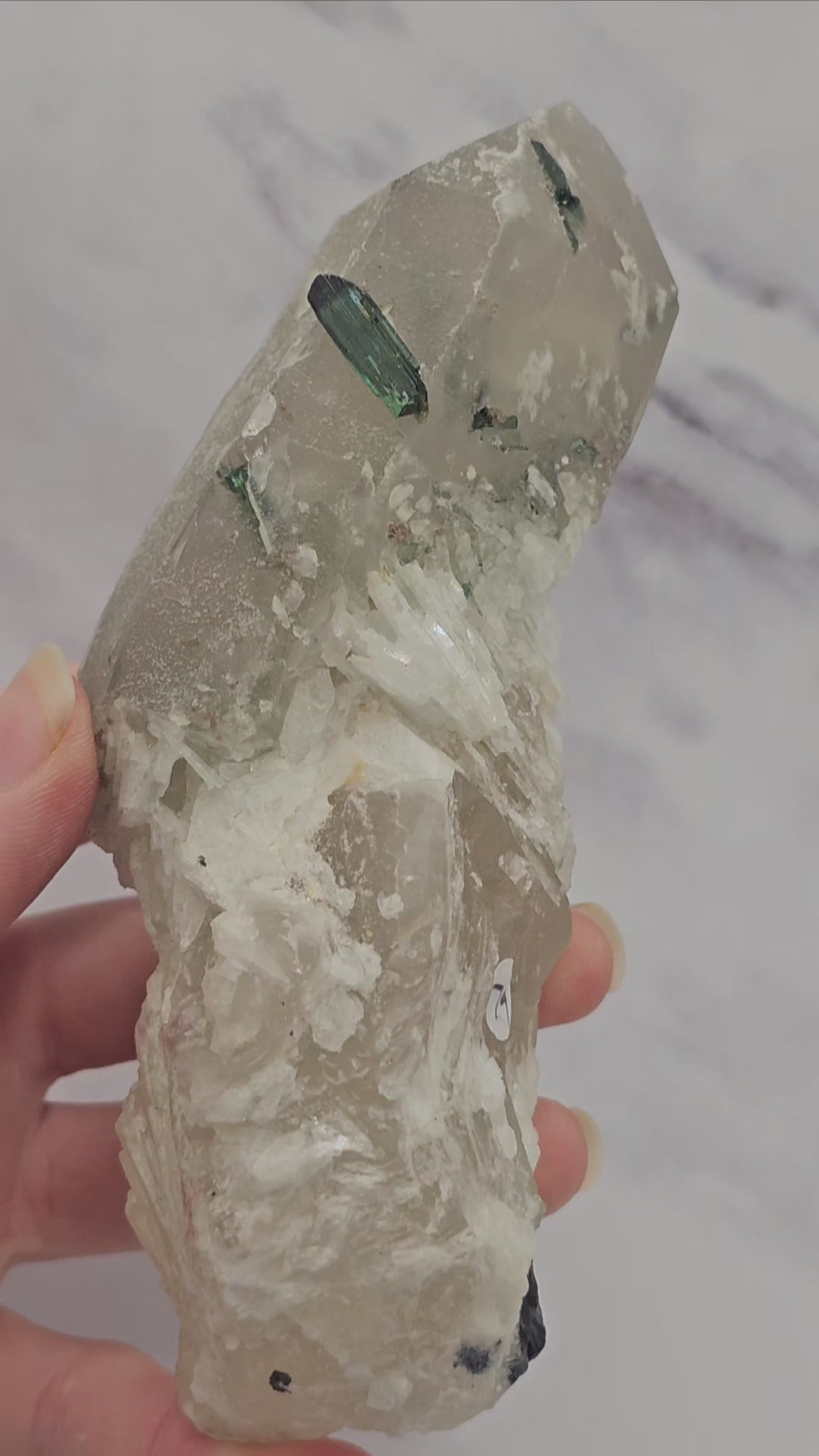 - Multiple primary growths of green tourmaline crystals can be seen fully enclosed by the secondary growth of quartz accompanied by other tourmaline crystals that are bursting out of the quartz
