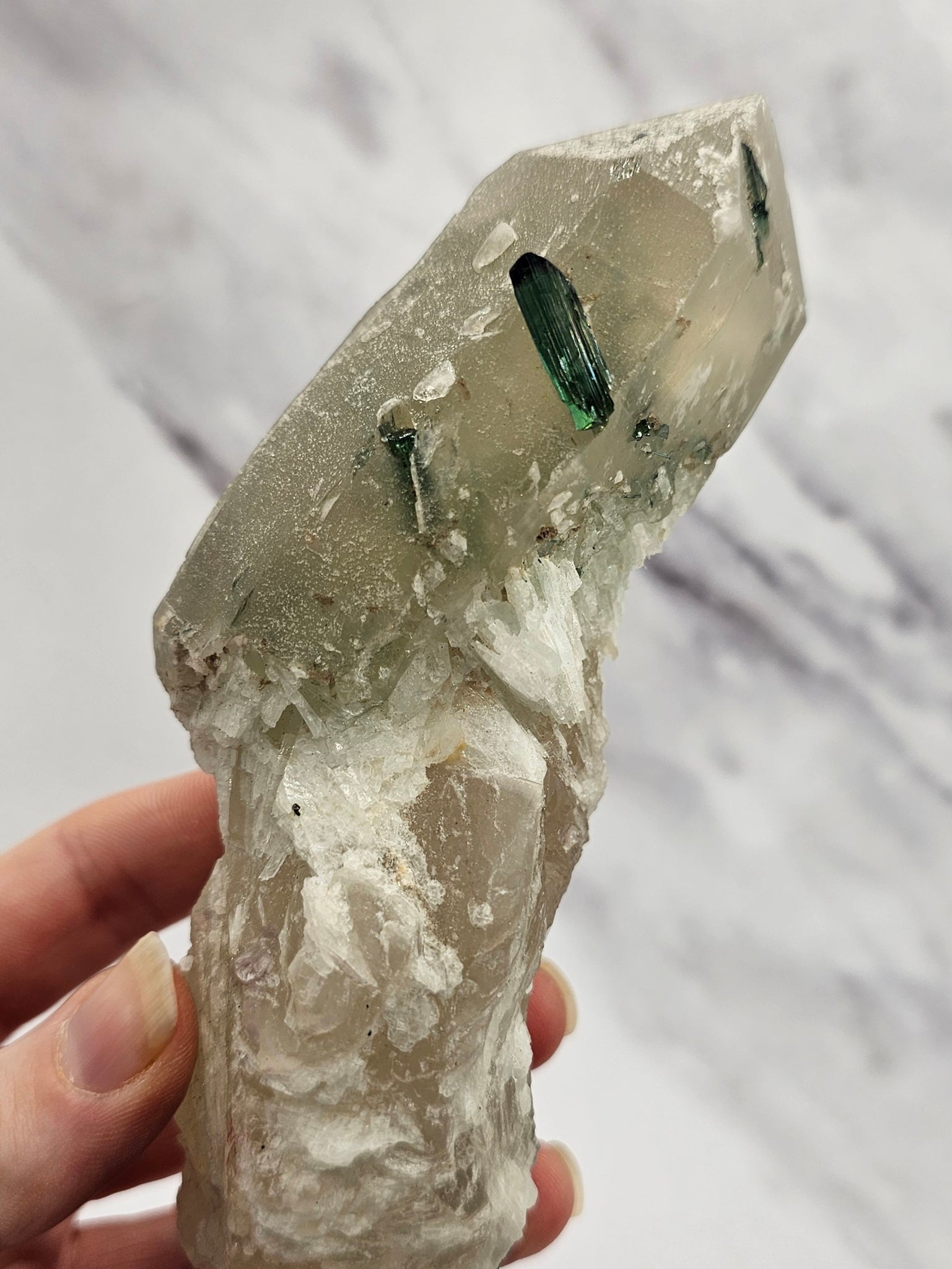 - Striking black capped, blue green tourmaline blade featured on one quartz face