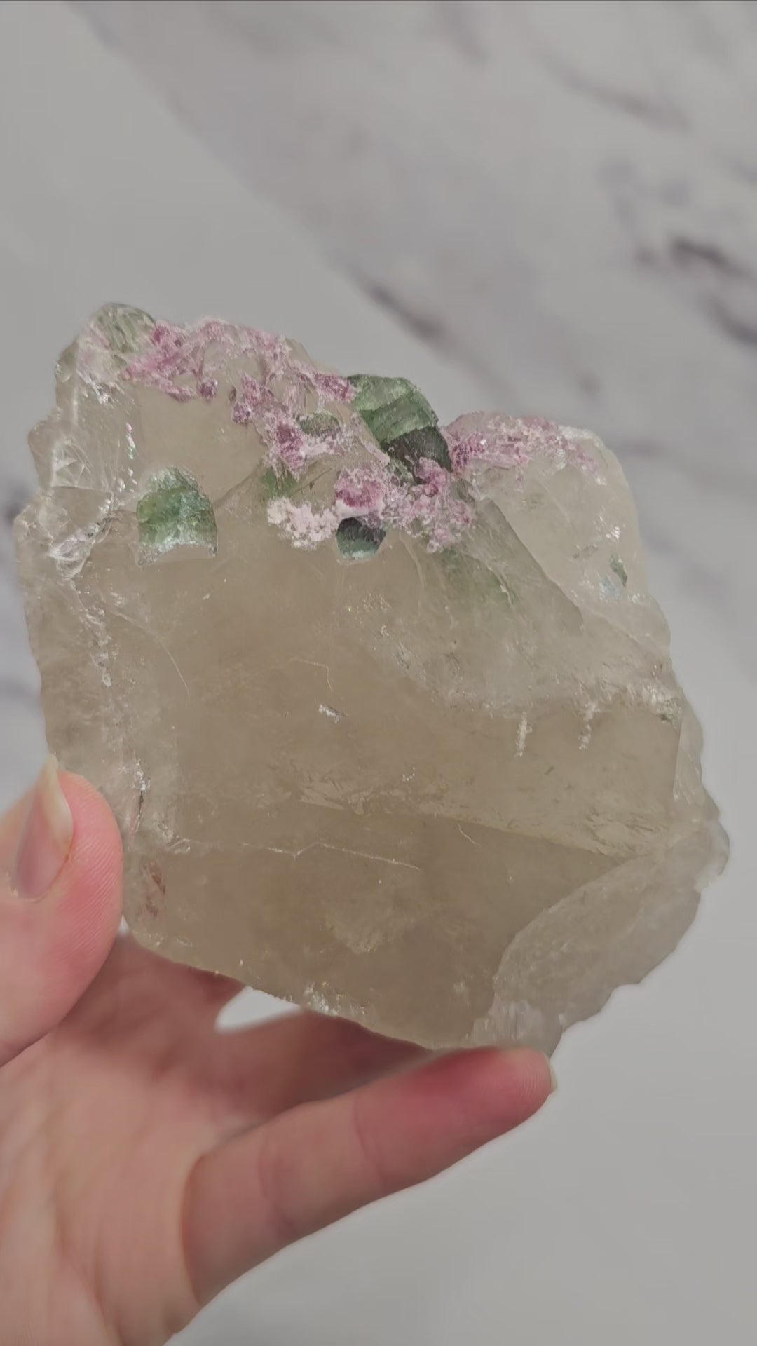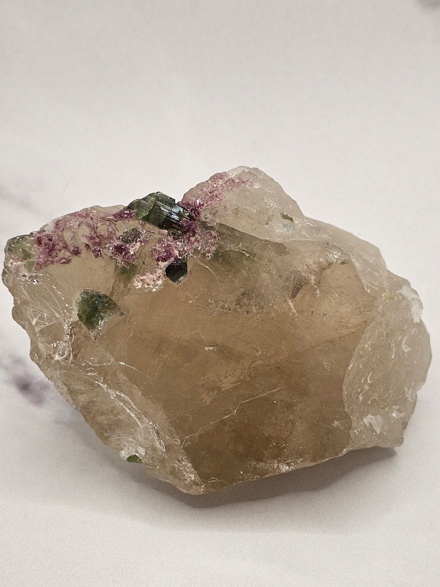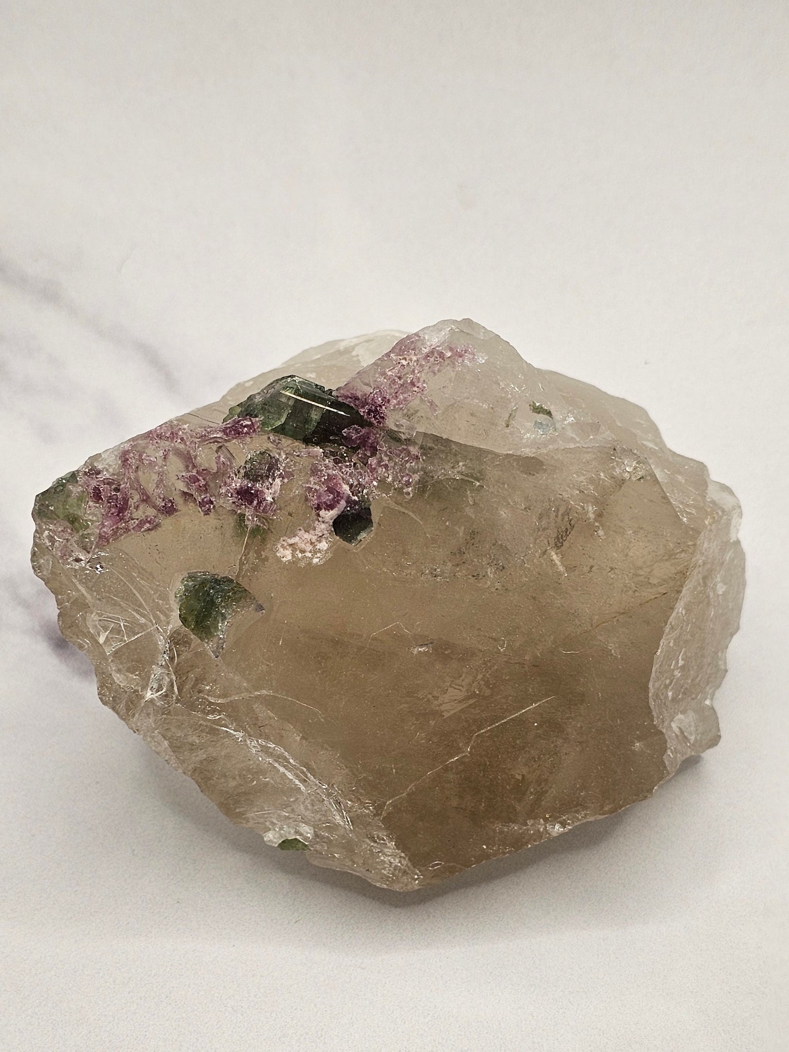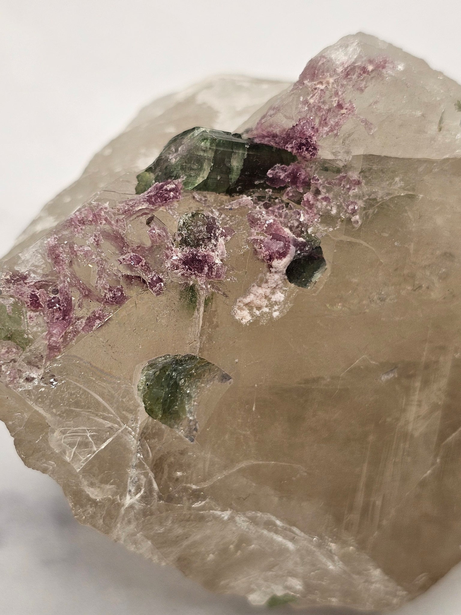 - Features penetrator watermelon tourmaline crystal surrounded by a bed of lepidolite sprinkled about